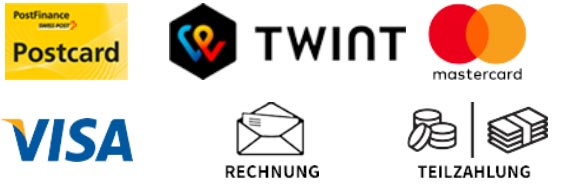 PostFinance Card, Kreditkarte Master oder VISA. Die Zahlung wird zu Datatrans umgeleitet. Datatrans benutzt neuste Sicherheitstechniken und Anti-Betrugssystem und garantiert dadurch sicheren Einkauf.